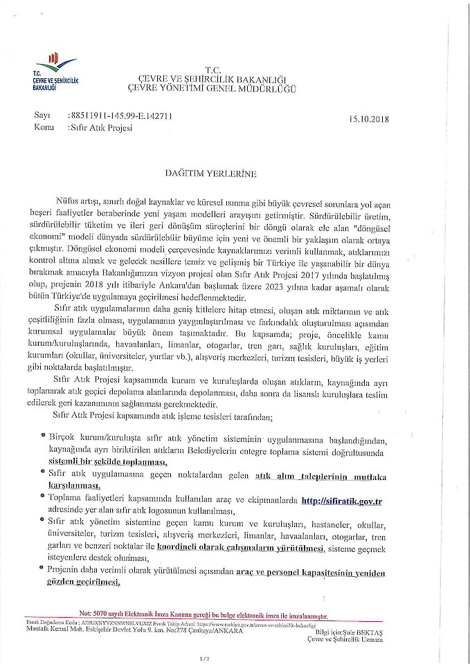 12/07/2019 tarihli ve 30829 sayılı Resmi Gazete'de yayımlanarak yürürlüğe giren Sıfır Atık Yönetmeliği'nce Sıfır Atık Yönetim Sistemi'ni kurarak Sıfır Atık Belgesi'ni almaya hak kazanmıştır.